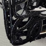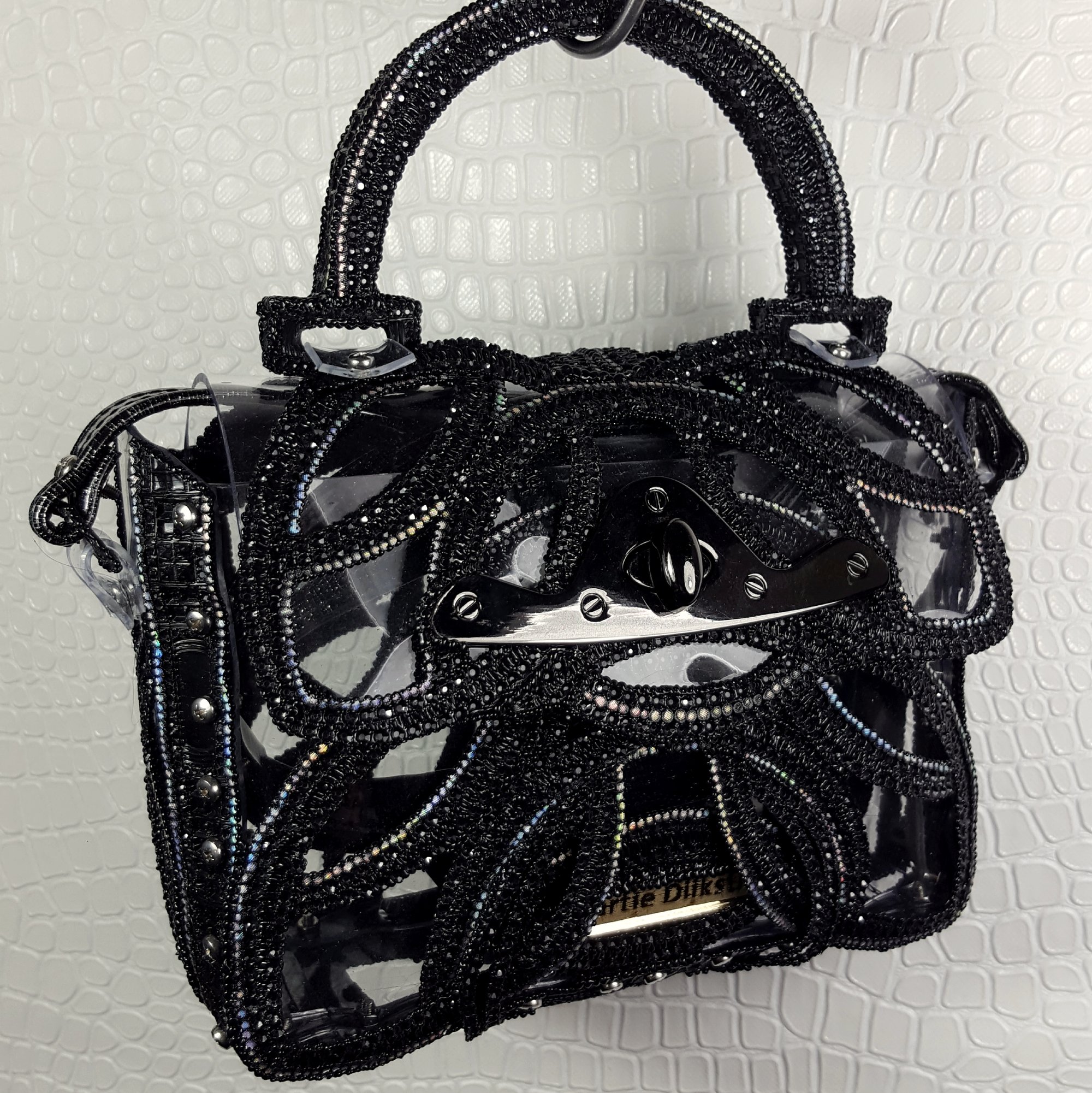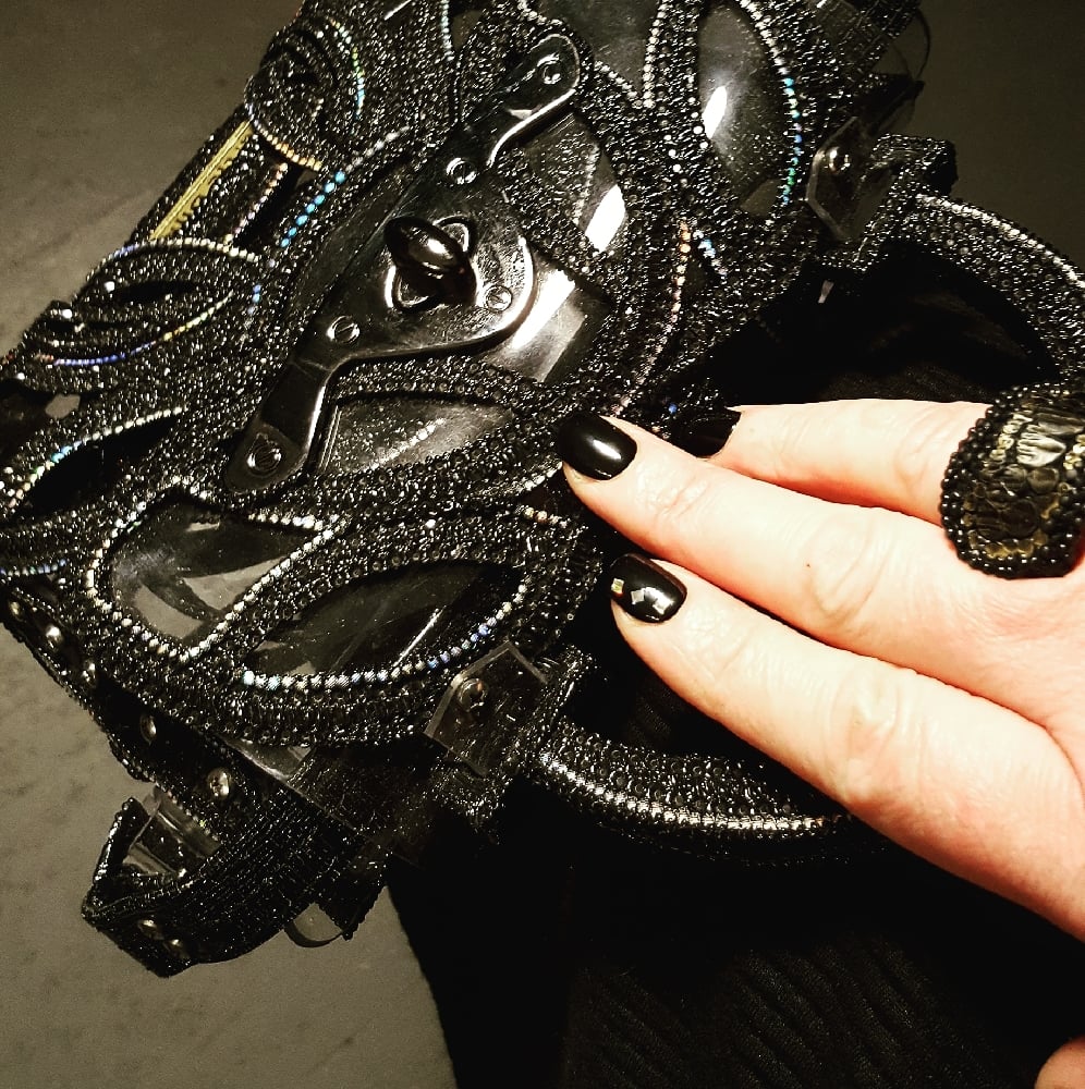 This unique handbag is totally hand printed with a 3Doodler, made out of transparent TPU and flexible 3D print filament. The black and special holographic details are created using a special printing technique. The bag is totally fixed with small, silver colored bolts and nuts and it closed with a dark metal turning toggle. It has a black glossy leather shoulder strap and a special manual 3D printed handle.